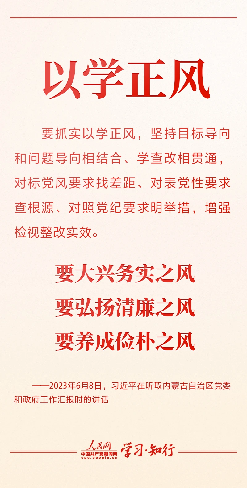 今年以來,習(xí)近平總書記先后在廣東、陜西、內(nèi)蒙古、江蘇等地考察調(diào)研,分別對主題教育根本任務(wù)中“以學(xué)鑄魂、以學(xué)增智、以學(xué)正風(fēng)、以學(xué)促干”四個方面作出深刻闡釋,四堂生動的黨課不斷推動主題教育深入開展、取得實(shí)實(shí)在在的成效。