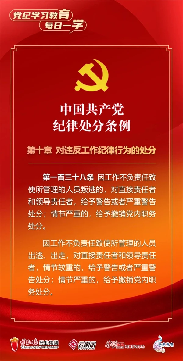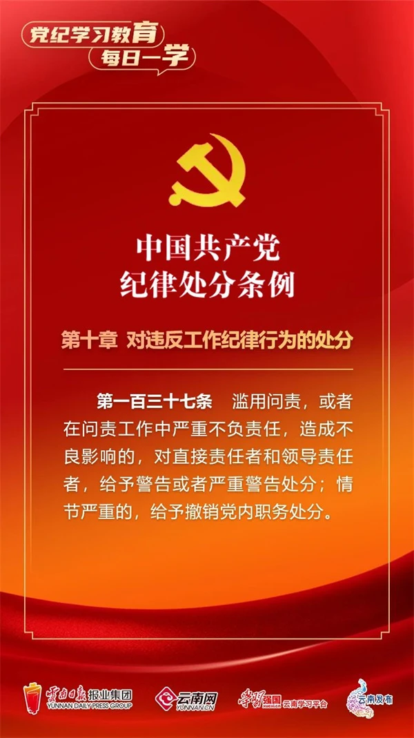 為深入學習貫徹落實習近平總書記關于黨紀學習教育的重要講話和重要指示精神,便于全省各級黨組織和廣大黨員、干部深入學習貫徹修訂后的《中國共產(chǎn)黨紀律處分條例》,云南網(wǎng)聯(lián)合“學習強國”云南學習平臺、云南發(fā)布共同策劃推出“黨紀學習教育•每日一學”專欄,營造全員參與、人人學紀的濃厚氛圍。今天,我們推出第65期,一起來學習。