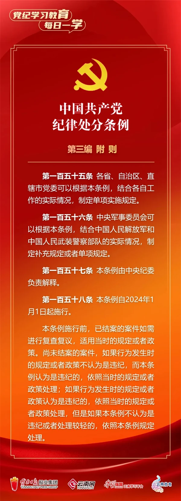 為深入學習貫徹落實習近平總書記關(guān)于黨紀學習教育的重要講話和重要指示精神,便于全省各級黨組織和廣大黨員、干部深入學習貫徹修訂后的《中國共產(chǎn)黨紀律處分條例》,云南網(wǎng)聯(lián)合“學習強國”云南學習平臺、云南發(fā)布共同策劃推出“黨紀學習教育•每日一學”專欄,營造全員參與、人人學紀的濃厚氛圍。今天,我們推出第74期,一起來學習。