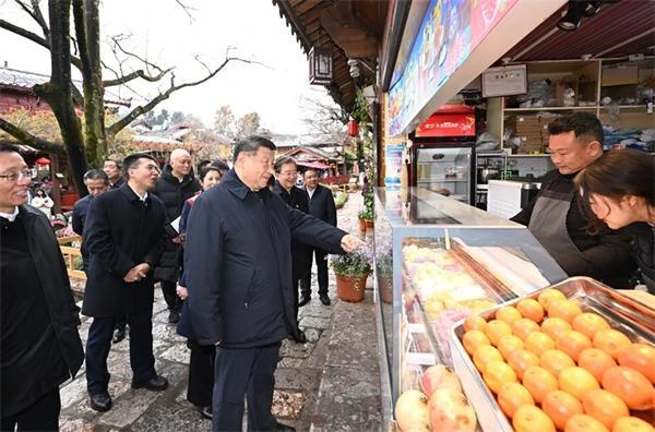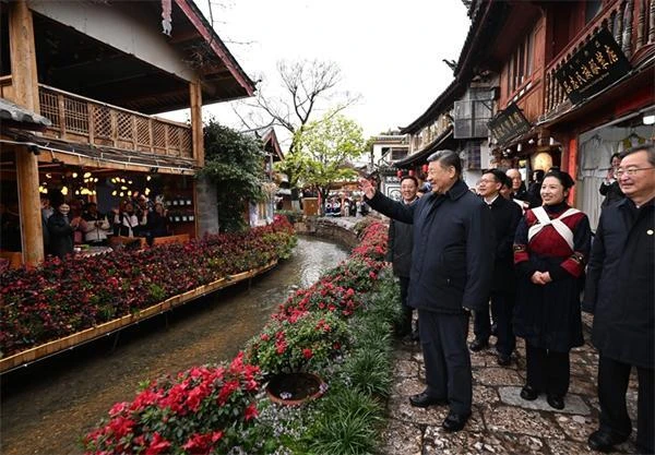 麗江古城有800多年歷史,被列入世界文化遺產名錄。一場春雪過后,麗江游人如織。習近平來到這里,詳細了解古城營建歷史、納西族民居特色和當地文化遺產保護利用、推動文旅融合發(fā)展等情況。居民和游客見到總書記十分興奮,爭相問好,有的還彈奏樂器、載歌載舞歡迎總書記。習近平頻頻與大家互動交流,了解商鋪經營狀況和游客感受。他要求當地處理好保護和發(fā)展的關系,讓這座美麗的古城煥發(fā)新的光彩。