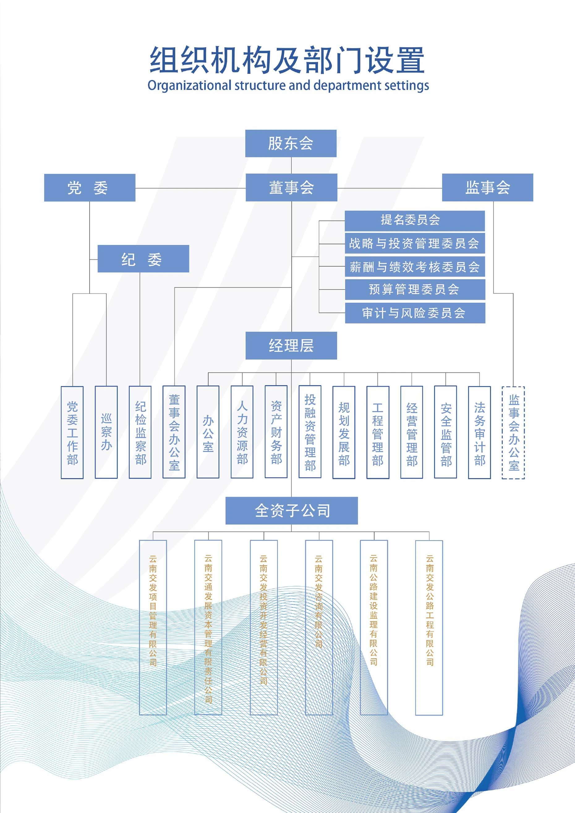云南交發(fā)投資開(kāi)發(fā)經(jīng)營(yíng)有限公司于2018年1月30日成立,注冊(cè)資本金10億元,為云南省交通發(fā)展投資有限責(zé)任公司全資子公司,公司內(nèi)設(shè)6個(gè)部門(mén),下設(shè)全資、控股、合資企業(yè)5個(gè)。